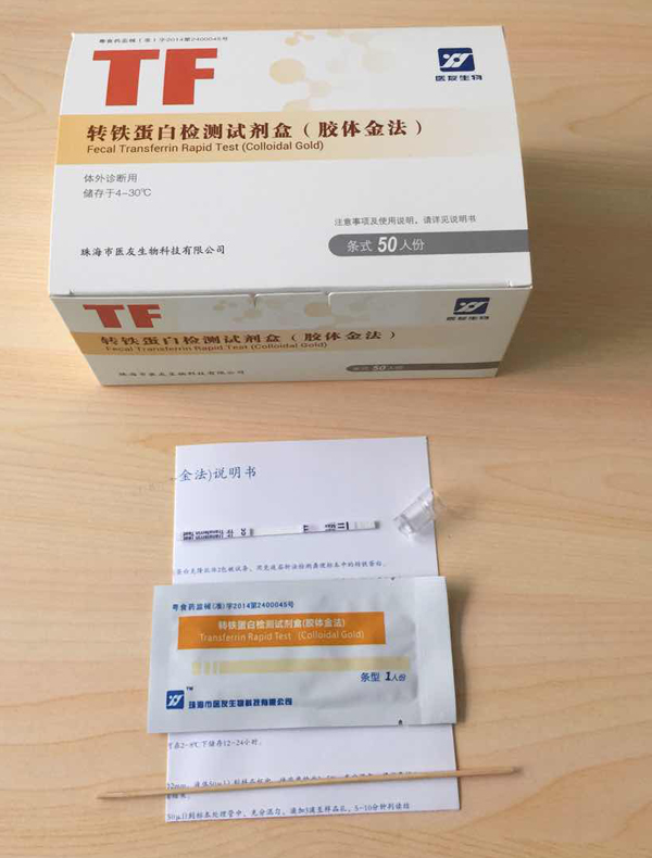 本試劑盒利用膠體金標(biāo)記小鼠抗人轉(zhuǎn)鐵蛋白單克隆抗體1,用小鼠抗人轉(zhuǎn)鐵蛋白克隆抗體2包被試條,用免疫層析法檢測糞便標(biāo)本中的轉(zhuǎn)鐵蛋白。